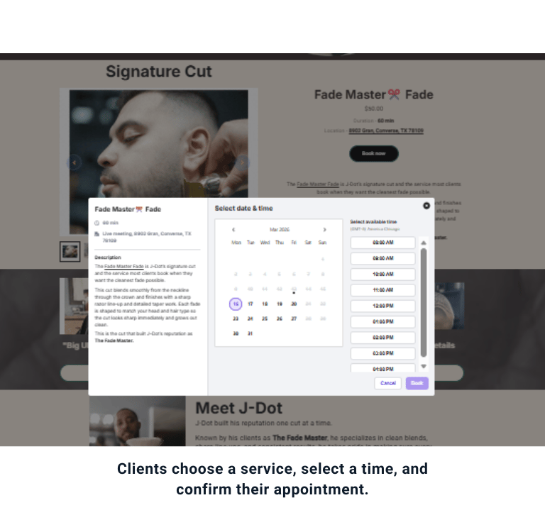 Clients choose a service, select a time, and confirm instantly — no DMs, no back-and-forth.