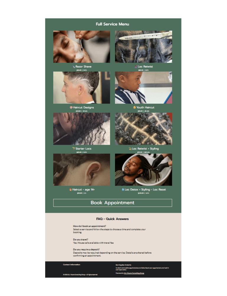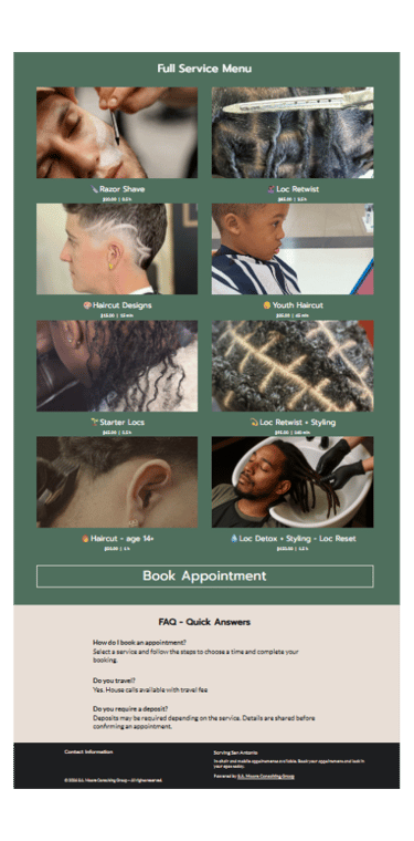 Your services, pricing, and booking link in one place.